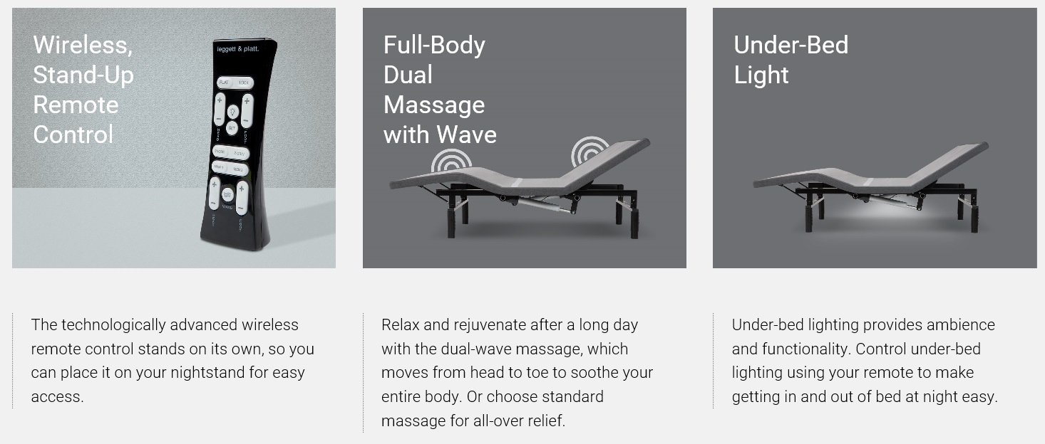The Leggett and Platt Simplicity Adjustable Bed Frame features a Patented Powerlift Motor with 850 lbs. lifting capacity which allows the Head adjust to preference. It includes 2.5" Steel Adjustable legs for heights ranging from 6-10". The Wireless back-lit display Remote features one-touch flat and two programmable positions plus a snore and zero gravity feature. Each base features Under-bed Lighting and dual massage units with wave (4 units for a king or cal king) and connectivity with a smart phone or tablet through Leggett's new app if desired.