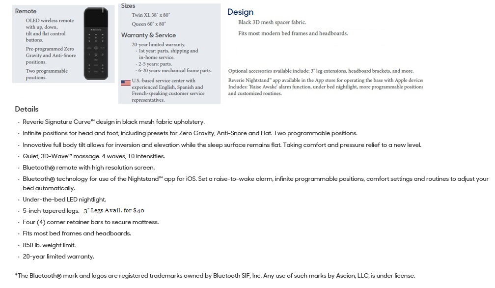 Reverie R600/650 Dual Inverter Tilt w/Massage Adjustable Bed